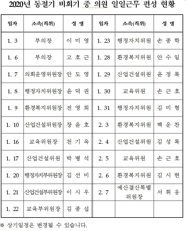 시의회(의장 황세영)는 오는 1월 3일부터 2월 7일까지(토요일 및 공휴일 제외) 이미영 부의장을 시작으로, 21명의 의원이 순번제로 의원 일일근무를 실시하여 민의수렴과 민원상담 등 대민 의정활동을 펼친다고 밝혔다.