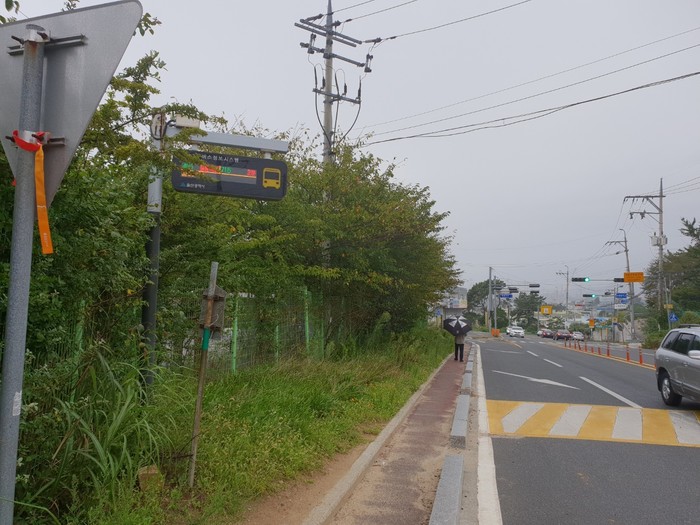 둘째, 원전 등 대형공사로 대형차량들이 수시로 지나가는 도로 바로 옆에 버스 표지판만 있어 버스 대기 시 차량 사고에 그대로 노출되어 있습니다.
