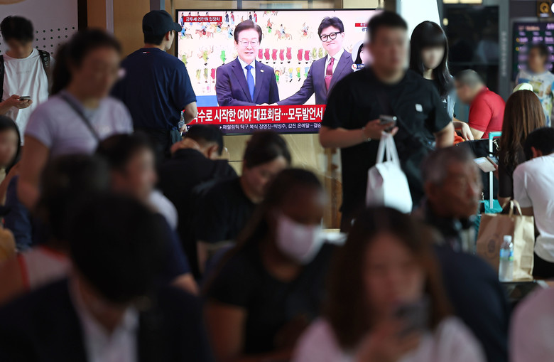 [세계타임즈 = 신상철 기자] 1일 오후 서울역에서 시민들이 국민의힘 한동훈 대표와 더불어민주당 이재명 대표의 여야 대표회담 TV 중계를 시청하고 있다. 2024.9.1