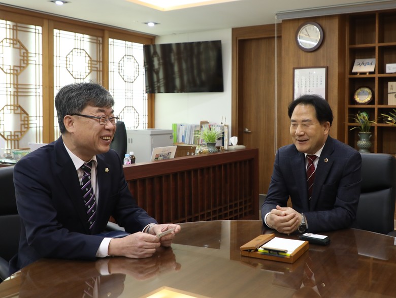 [세종 세계타임즈=이채봉 기자] 세종특별자치시의회(의장 상병헌) 직원들은 14일 본회의장과 공간 배치 등 시설을 벤치마킹하기 위해 방문한 부산 동래구의회 정명규 의장과 의회사무국 직원들을 접견했다.