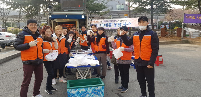 [대전=세계타임즈 이장성 기자] 7천명 SNS 대전광역시 봉사단체 사랑의 사다리 밴드(리더 이정제)는 29일 오전11시, 대덕구 목상동 다사랑아파트 경로당에서 (주)동건운수(대표 이선엽)와 함께 바베큐통닭 120마리 봉사로 사회적 효행을 실천하였다.