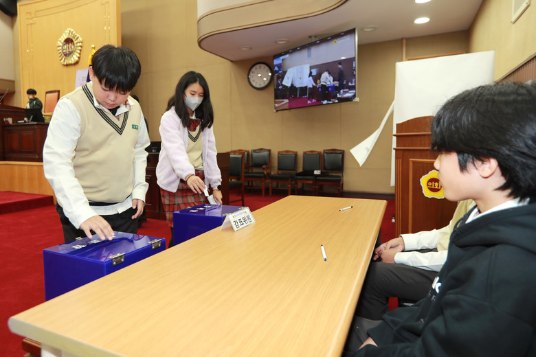오성중학교 학생들은 무기명 투표를 통해 청소년 의장을 선출하고 ‘교복착용 의무화 규정 도입 조례안’과 ‘운동장 쓰레기통 배치 건의안’, ‘학교 주말 기숙사 운영 건의안’ 3건의 안건을 심의‧의결했다.