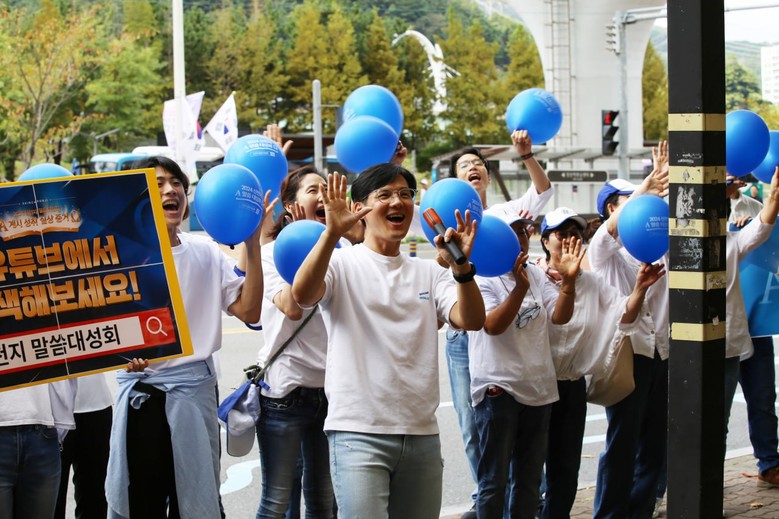 ▲28일 오전 신천지예수교 증거장막성전(신천지예수교회) 부산야고보지파 부산교회 성도 1000여명이 광안리 해변 일대에서 ‘2024 신천지 말씀대성회 계시 성취 실상 증거’ 홍보를 하고 있다. [사진 제공 = 신천지 부산교회]