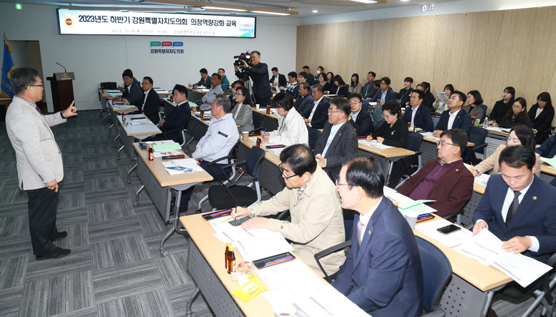 [강원도 세계타임즈=김민석 기자] 강원특별자치도의회(의장 권혁열)는 10월 26일 도의회 세미나실에서 도의원 및 의회사무처 직원을 대상으로 ‘2023년 하반기 의정역량강화 교육’을 실시했다고 밝혔다.