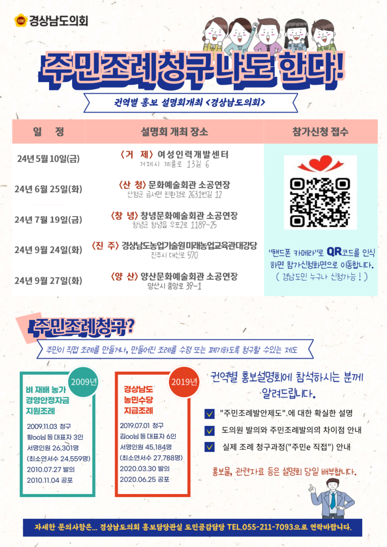 - 주민조례발안제도에 대한 도민홍보와 도내 및 타시도 입법사례 공유 [경남 세계타임즈=최성룡 기자] 경상남도의회(의장 김진부)는 주민이 직접 우리 지역에 필요한 조례의 제정·개정·폐지를 청구할 수 있는 ‘주민조례발안제도’에 대한 홍보설명회를 경상남도를 남부권, 북서부권 등 5개 권역으로 구분하여 개최한다.