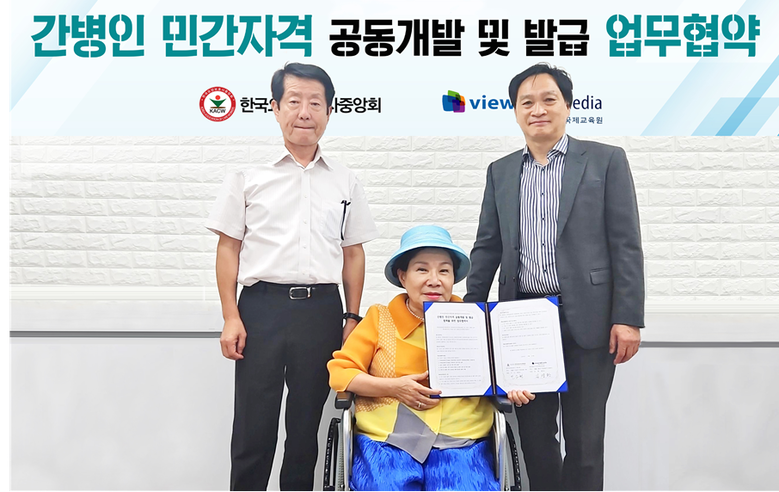 이날 간병인에 대한 공동 관심사를 추진하기 위해 한요중 민소현 회장과 뷰레일미디어국제교육원 김영환 원장은 간병인 전문 민간자격의 개발과 발급을 위한 업무협약을 체결하였다.