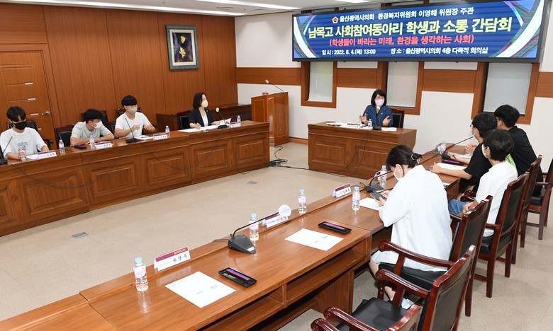 [울산 세계타임즈=이호근 기자] 울산광역시의회 이영해 위원장(환경복지위원회)은 4일 오후 시의회 4층 다목적회의실에서 남목고등학교 사회참여동아리 ‘다원’ 회원들과 소통의 장을 마련했다.