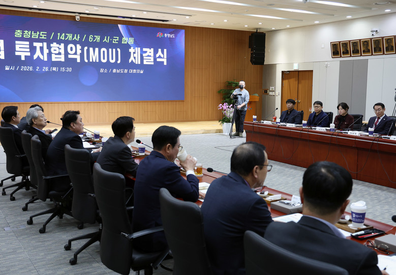 김태흠 지사는 26일 도청 대회의실에서 김석필 천안시장 권한대행 등 6개 시군 단체장 또는 부단체장, 이동주 성창오토텍 대표이사 등 14개 기업 대표와 투자협약을 체결했다.