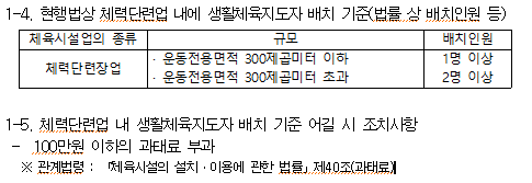관련 법인 「체육시설의 설치·이용에 관한 법률(체육시설법)」에 체력단련장에 대한 안전점검은 6개월에 1번 실시하도록 하고, 면적에 따라 생활체육지도자를 1명 이상 배치하도록 명시하고 있어, 이를 어길 시에 100만원 이하 과태료를 부과하는 규정에 따라 안전점검을 실시하고 있으나 여전히 사각지대에 놓여 있는 실정이다.*