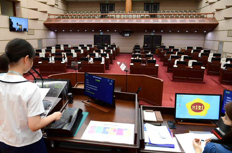 이날 모의의회에 참여한 학생들은 의장 후보자들의 정견발표를 듣고 본회의장 내에 마련된 기표소에서 직접 투표하여 의장을 선출하면서 선거가 이루어지는 과정 하나하나를 직접 체험해보고, ‘지구 온난화 문제 해결 방안’ 등 5분 자유발언과 직접 발의한 ‘여성징병제 도입 촉구 건의안’에 대해 열띤 찬반 토론을 거쳐 전자투표에 의한 표결로 건의안을 의결하기도 하였다.