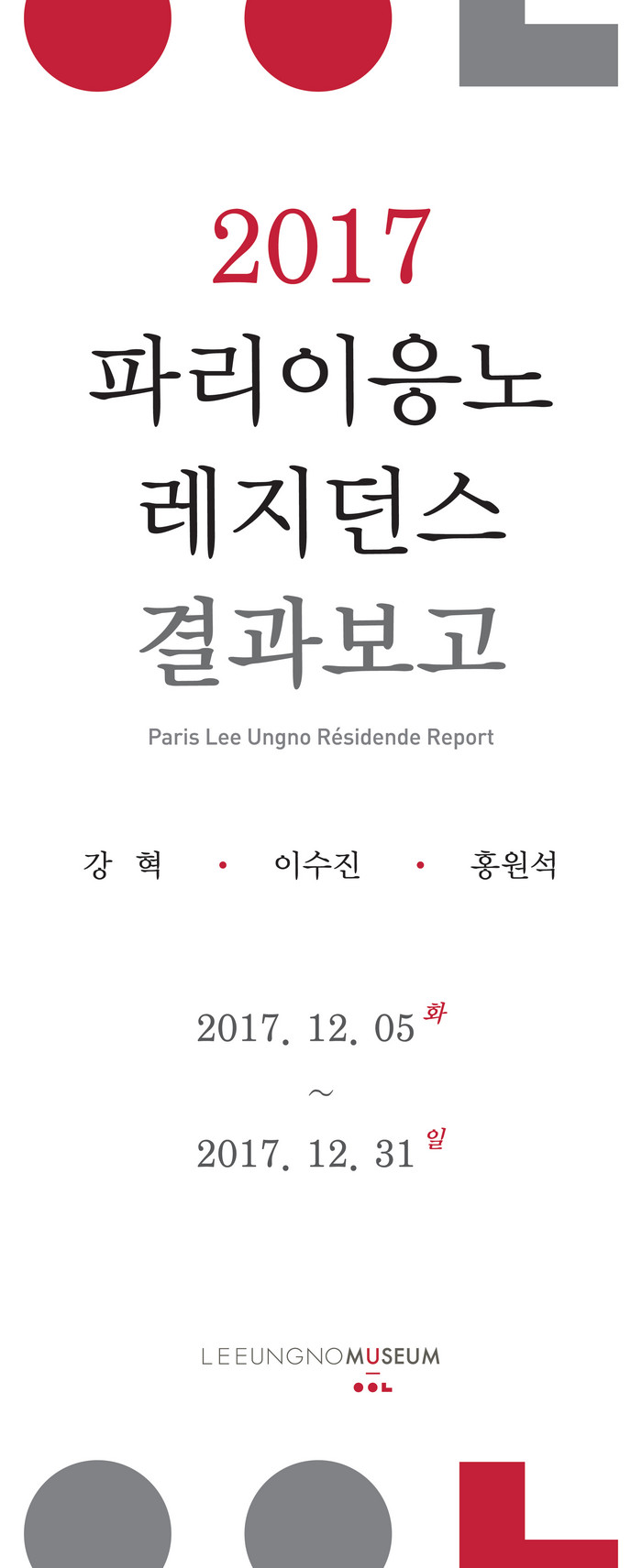 이 전시는 지난 8월 파리이응노레지던스 4기 입주 작가로 선정·파견된 강혁, 이수진, 홍원석 3인 작가가 그 간의 작품 활동 결과 및 성과를 알리기 위해 마련되었다.