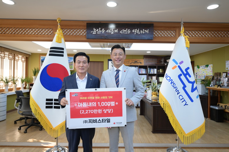 논산시(시장 백성현)는 26일 국내 대표 유·아동 내의 전문 기업 ㈜지비스타일(대표 박용주)이 내의 등 2,270만 원 상당의 아동 의류 1,000벌을 기탁했다고 밝혔다.