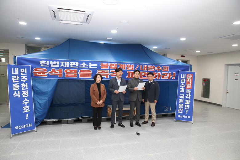 12일 오전 익산시의회 청사 1층에서 김경진 의장을 비롯한 민주당 소속 의원들은 헌법재판소가 윤석열을 파면할 것을 촉구하는 내용의 성명서를 발표하고 릴레이 농성을 시작했다.