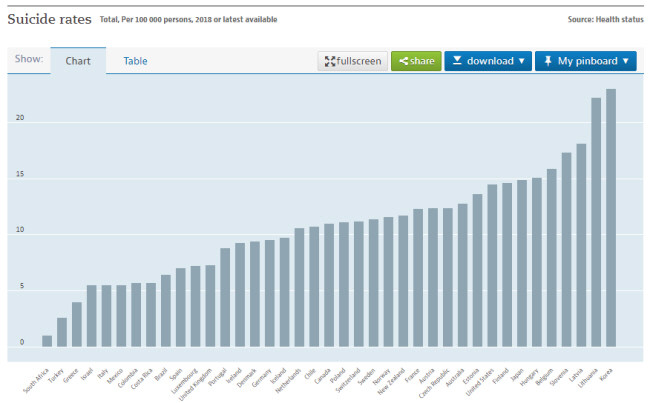 사실 코로나19 사태 이전에도 우리나라는 10년이 넘는 세월동안 OECD국가 내 자살률 1~2위를 유지해 왔다. OECD공식데이터에 따르면, 2019년 한국의 자살률은 인구 10만명당 23명으로 집계돼 가입국 중 1위였다. 남성은 37.4%로 2위, 여성은 14.1%로 1위로 나타났다.