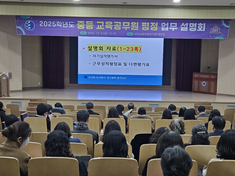 [대전 세계타임즈=이채봉 기자] 대전시교육청은 12월 5일, 8일 양일간 대전교육과학연구원에서 중·고·각종·특수학교 교감과 교사, 교육전문직원을 대상으로 2025학년도 중등 교육공무원 평정 업무 설명회를 개최했다.
