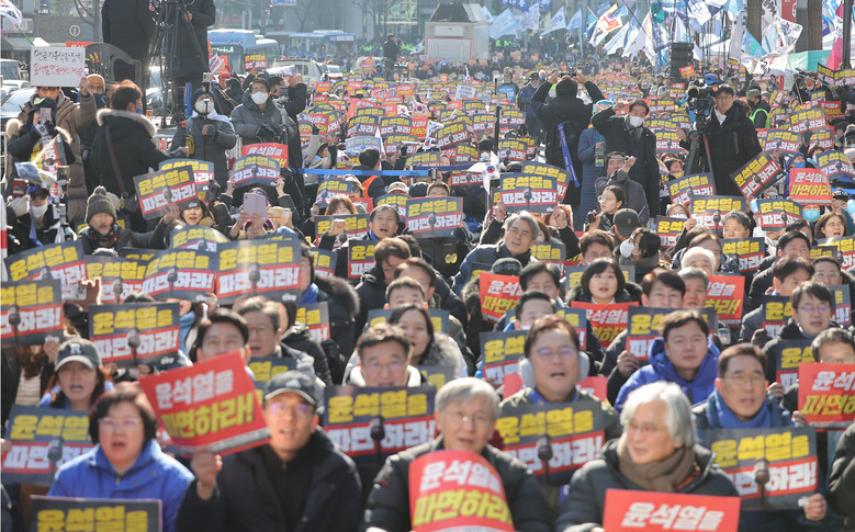 탄핵을 촉구하는 집회도 곳곳에서 열렸다.'윤석열 즉각 퇴진·사회대개혁 비상행동'(비상행동)은 오후 5시 경복궁역 4번 출구 인근에서 윤 대통령 파면을 촉구하는 집회를 열었다.윤순철 비상행동 공동위원장은 "경호처는 내란수괴를 보호하고, 검찰은 경호처 수사를 가로막고, 계엄에 관여했던 경찰은 승진했다"며 "헌재는 윤석열을 파면해 내란의 책임을 확실하게 물어야 한다"고 주장했다.