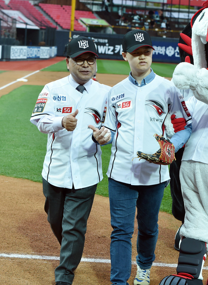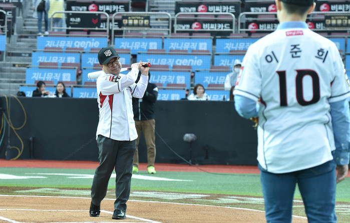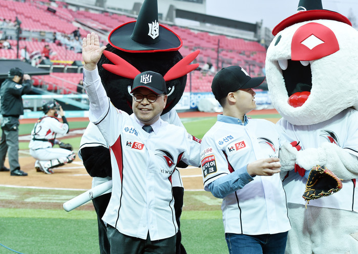 [경기도=세계타임즈 이영진 기자] 이재정 경기도교육감이 26일 수원 KT위즈파크에서 프로야구 경기(KT위즈 대 SK와이번즈)에 앞서 학생(이준희, 아름학교 3학년) 시구에 시타를 하고 있다.