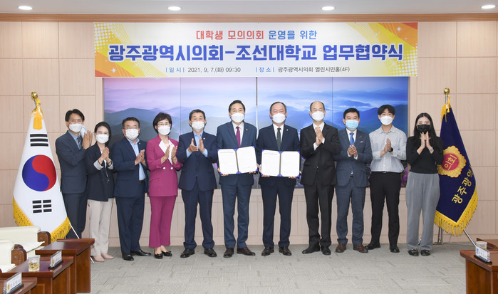 [광주=세계타임즈 손권일 기자] 광주광역시의회(의장 김용집)는 9월 7일(화) 시의회 열린시민홀에서 조선대학교와 대학생 모의의회 운영을 위한 업무협약을 체결했다고 밝혔다.