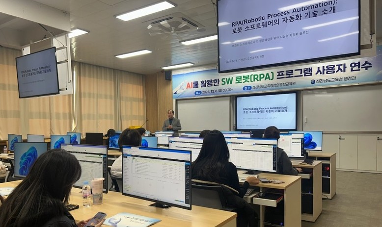 전라남도교육청은 8일 창의융합교육원에서 교육지원청 학교종합지원센터 교육공무직원 급여 담당자를 대상으로 ‘AI를 활용한 SW 로봇(RPA) 프로그램 사용자 연수’를 실시했다.