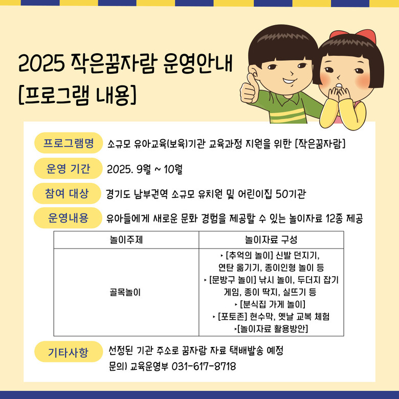 이번 프로그램은 경기도 남부권역 내 3~5세 전체 유아 수 20명 이하인 소규모 기관을 대상으로 선착순 신청을 받아 운영된다.