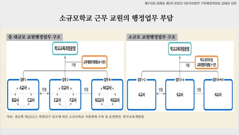 학생 수가 점점 줄어들고 있는 학교의 경우, 학생 수에 따라 교사의 정원도 줄어들어 학습 및 생활지도를 집중적으로 관리하여야 함에도 학교 운영.행정업무의 부담까지 떠안아 결국은 보호되어야 할 학생들의 공교육 여건까지 악화되고 있다며 문제를 지적했다.