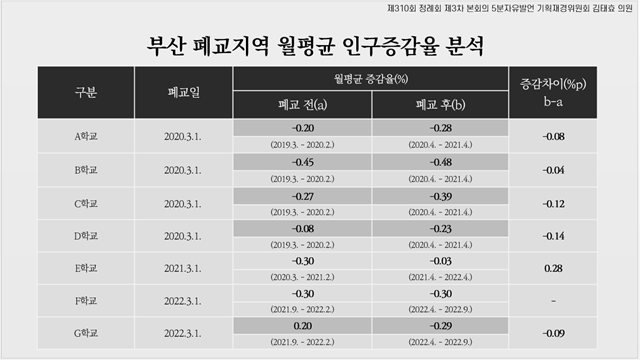 ·학교 폐교 전․후 월평균 인구 증감율 분석해보니, 폐교 후 지역 인구 감소율 증가 확인·교육환경의 격차를 줄이기 위해 지역․사회적 특성을 고려한 형평성 차원에서의 교육정책 강조 [부산 세계타임즈=이용우 기자] 부산시의회 기획재경위원회 김태효 의원(국민의힘, 해운대구3)은 제310회 정례회 5분자유발언을 통해 부산시 지역 간 교육여건의 부익부 빈익빈 현상을 지적하며, 교육환경의 격차를 줄이기 위해서는 경제적 효율성에 입각한 정책으로는 해결되지 않는다며 지역.사회적 특성을 고려한 형평성 차원에서의 교육정책을 강조했다.