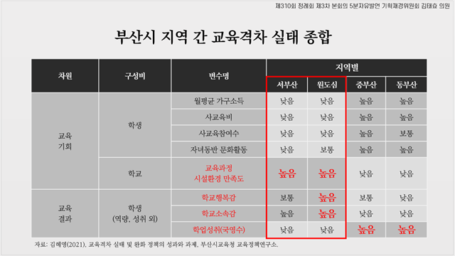김태효 의원, 부산시 지역 간 교육여건의 부익부 빈익빈 현상 지적 “교육정책은 효율성이 아닌 형평성에 집중해야”