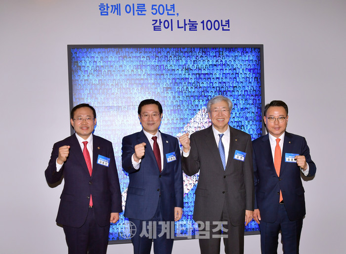 | ▲이용섭 광주광역시장이 19일 오후 서구 김대중 컨벤션센터에서 열린 '광주은행 창립 50주년 전야제 및 100년 은행 선포식'에 참석해 기념촬영을 하고 있다. 왼쪽부터 김동찬 광주시의회의장, 이용섭 광주시장, 김한 JB금융지주 회장, 송종욱 광주은행장 |
