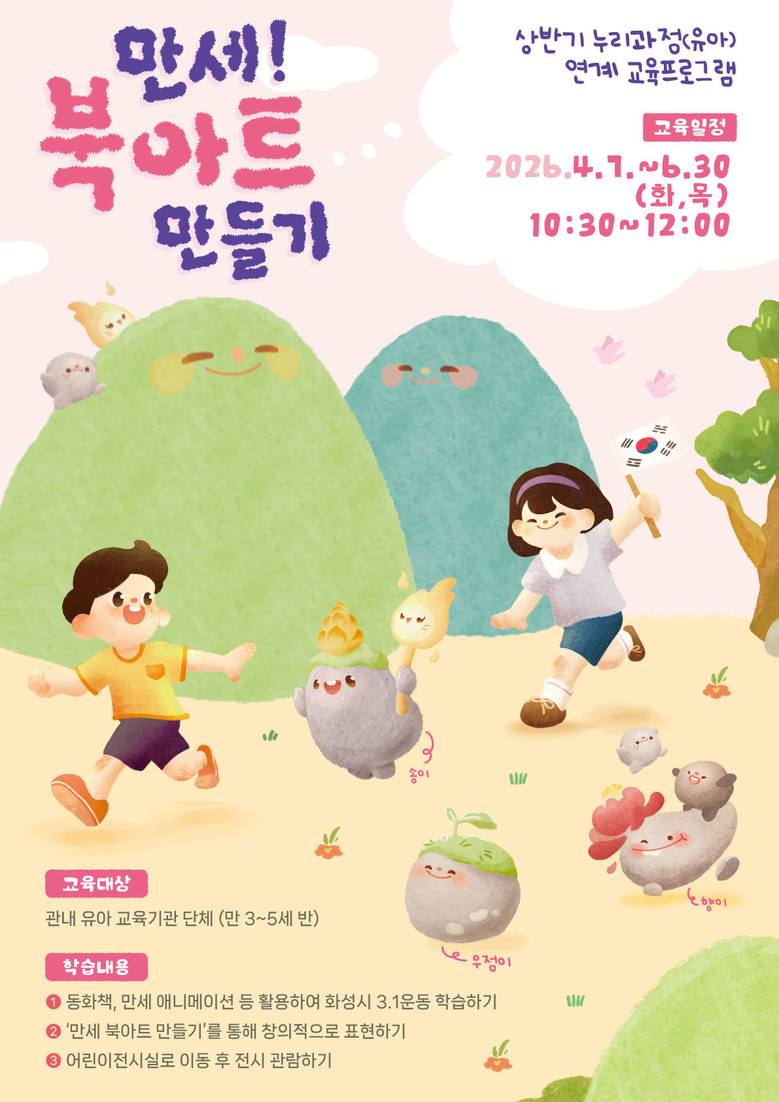 이번 프로그램은 화성시 3·1운동의 역사적 가치를 유아들이 쉽고 친근하게 이해할 수 있도록 기획됐으며, 만 3~5세 유아를 위한 국가 수준 공통 교육과정인 ‘누리과정’을 기반으로 구성됐다. 특히 영유아의 발달 특성을 고려해 신체적·감각적 활동과 비언어적 표현을 중심으로 한 체험형 교육으로 운영된다.