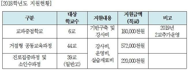 - 거점형 공동교육과정 운영 확대: 선택 학생 수가 적어서 단위학교 내에서 개설할 수 없는 소인수과목이나 심화과목을 인접 학교 간 공동으로 개설해서 운영함으로써 학생들의 과목 선택 및 수강 기회를 확대함