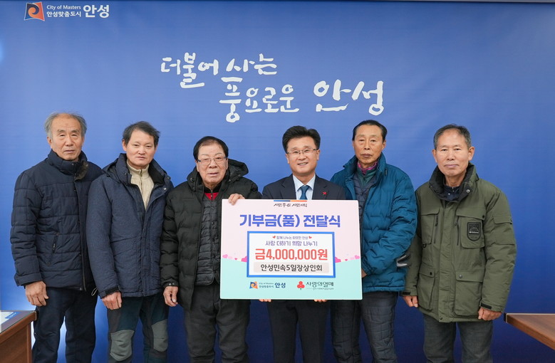 [안성시 세계타임즈=송민수 기자] 안성시는 1월 8일(목) 민속오일장 상인회(대표 임문식)로부터 400만 원의 성금을 전달받았다고 밝혔다. 전달식에는 상인회 임원진과 시 관계자가 참석한 가운데 진행되었다.