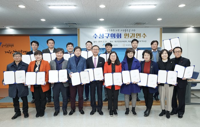 [수성구=세계타임즈 한성국 기자] 수성구의회(의장 김희섭)는 최근 공직자 및 정치인들의 폭행, 성차별 발언, 갑질 등 인권침해 행위가 사회적 이슈가 되고 있는 가운데 대구.경북 지방의회 최초로 의원들이 자발적으로 인권사무소를 찾아 인권교육에 동참하는 등 인권에 대한 인식 개선에 앞장서 눈길을 끈다.