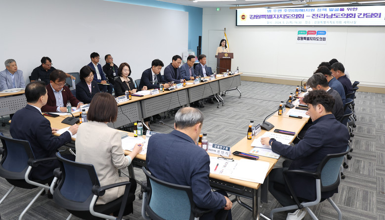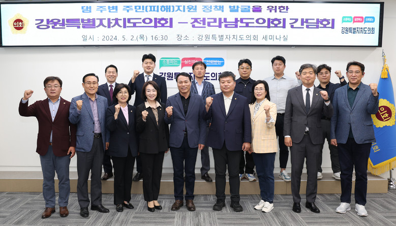 [강원도 세계타임즈=김민석 기자] 강원특별자치도의회 소양강댐 주변지역 피해지원 연구회(회장 박기영의원, 간사 양숙희의원)는 5월 2일 오후4시경 도의회 세미나실에서 전남도의회「댐환경특별위원회」(위원장 정영균의원)와 간담회를 개최하였다.