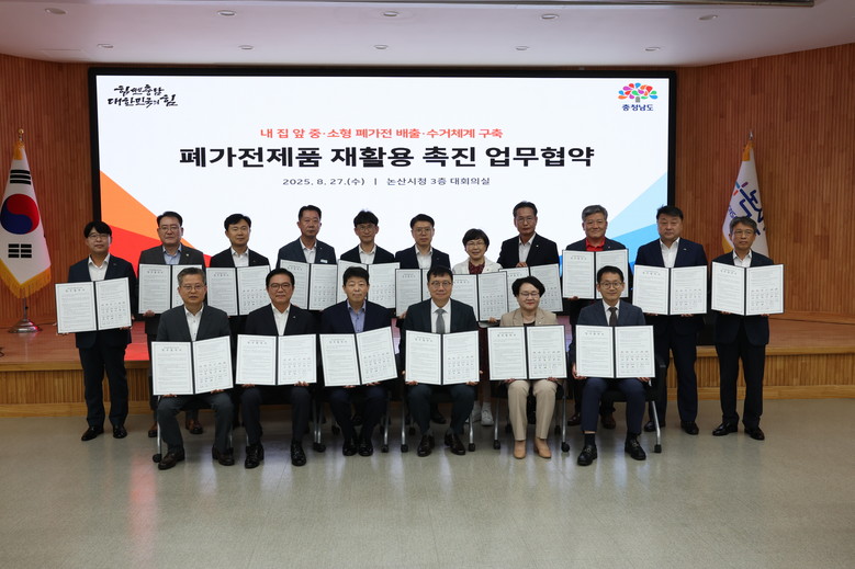 도는 27일 논산시청 대회의실에서 열린 ‘2025년 제4회 도·시군 정책현안 조정회의’에서 박정주 행정부지사와 정덕기 이(E)-순환거버넌스 대표, 시군 부단체장 등이 ‘중·소형 폐가전제품 재활용 촉진 업무 협약’을 체결했다고 밝혔다.