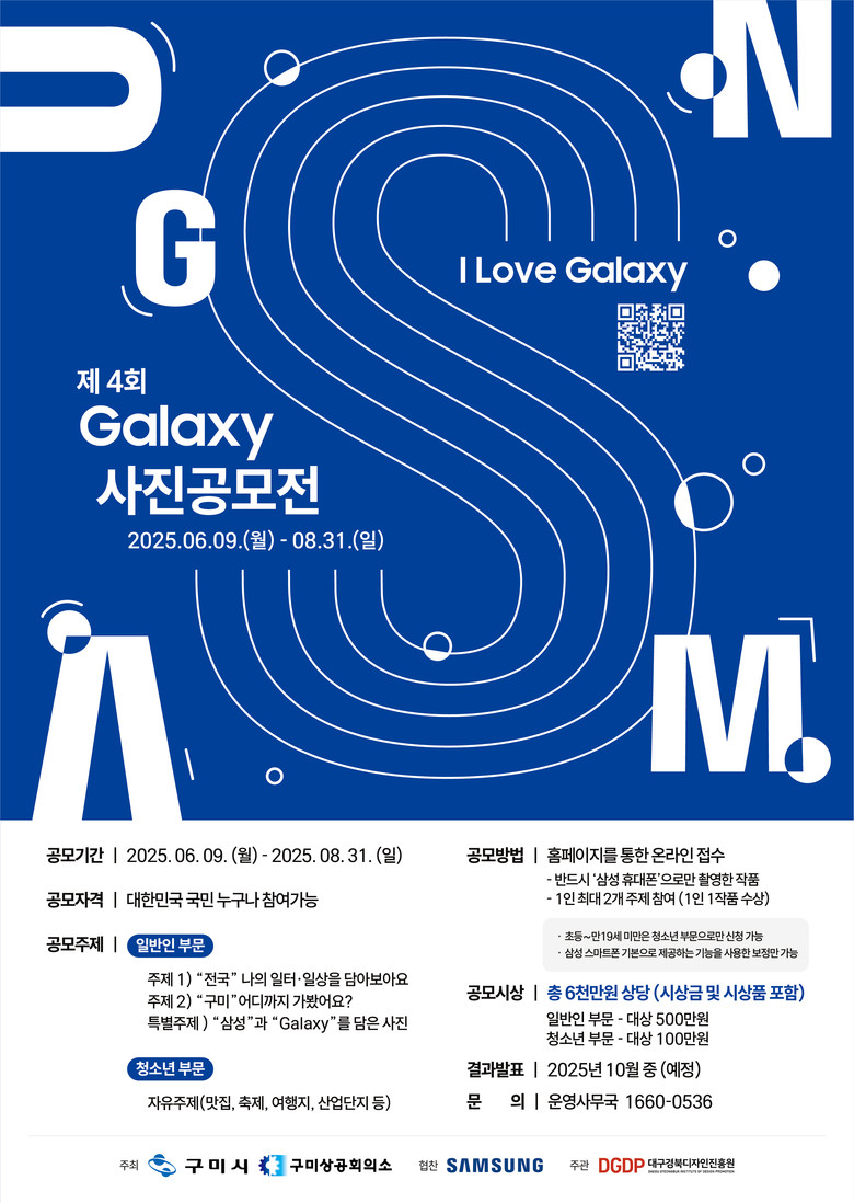 - 청소년 부문 신설, 일반인 인기투표 도입 등 참여 확대 [구미시 세계타임즈=한윤석 기자] 구미시와 구미상공회의소는 삼성전자, LG경북협의회와 함께 6월 9일부터 8월 31일까지 전국민을 대상으로 사진·영상 공모전을 개최한다. 총상금 및 상품 규모는 「제4회 Galaxy 사진공모전」 6천만원, 「제3회 LG 영상공모전」 2천5백만원 상당이다.
