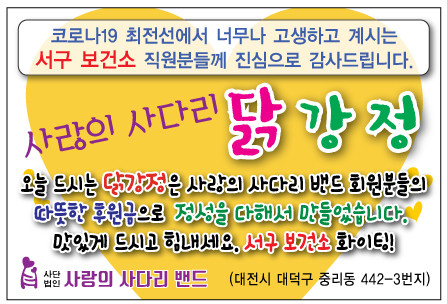 서구보건소 김은희 감염병관리팀장은 “오늘 사랑의 사다리 봉사단체에서 맛있는 닭강정을 지원해 주어서 큰 힘과 위안이 된다.”면서 “서구보건소는 코로나 19가 하루속히 종식될 수 있도록 최선의 노력을 다하겠다.”고 말했다.