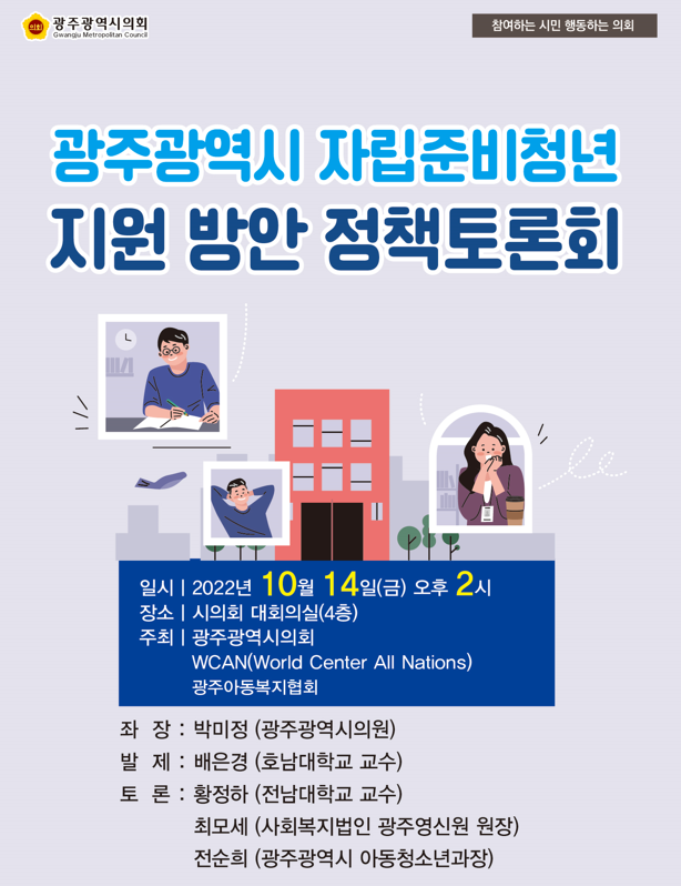 [광주 세계타임즈=손권일 기자] 광주광역시의회는 14일 오후 2시 시의회 4층 대회의실에서 ‘자립준비청년 지원 방안마련’이라는 주제로 정책토론회를 개최한다.