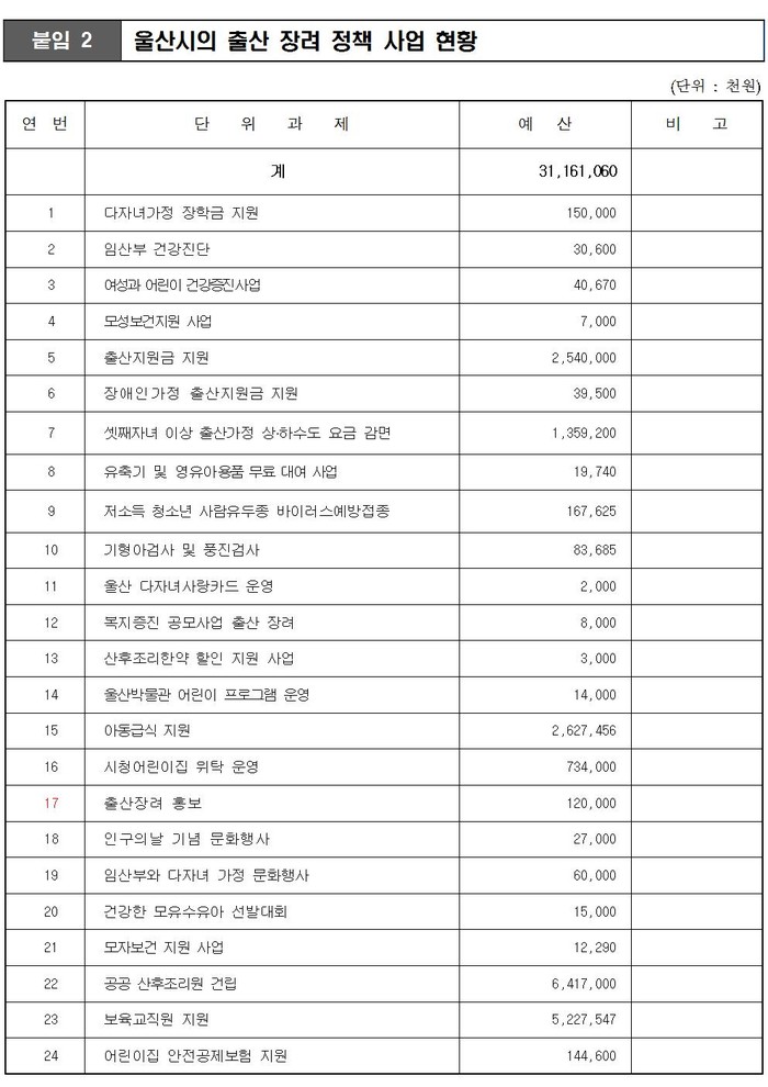우리시는 출산율을 높이기 위하여 출산과 더불어 아이 및 산모 건강을 지원하고, 아이의 보육 등 출산부터 일자리까지 정부정책과 함께 다양한 정책을 추진하고 있으며, 그 중 울산시만의 출산정책 사업은 53개 사업에 총 312억의 사업비를 투입하여 〔붙임 2〕와 같이 추진하고 있습니다.