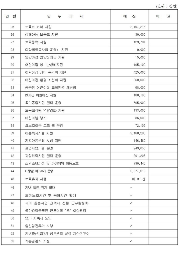먼저, 출산장려지원 분야의 사회복지/보육.가족 및 여성 분야 예산 1억 7천만원이 줄어든 사유는 우리시의 어려운 예산사정을 감안한 출산장려 관련 홍보 사업비 15백만원과 지속적인 인구증가 노력에도 불구하고 출생아수 감소에 따른 출산장려금 160백만원이 감소하였으며,