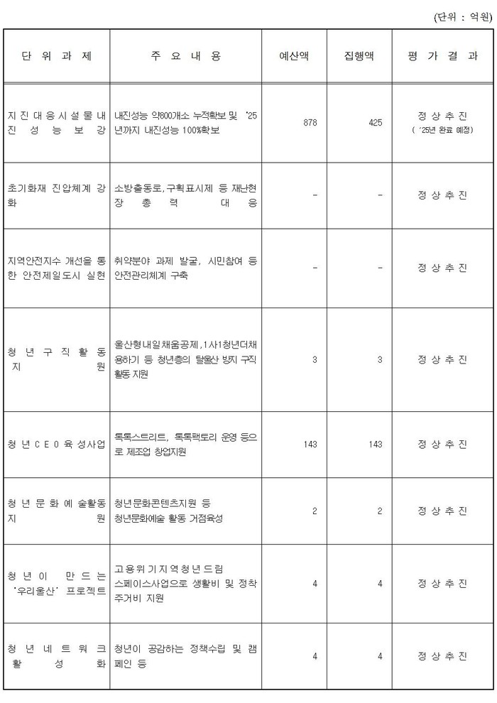 둘째, 「울산인구증가대책」 추진에 대한 단위 사업별 예산과 단위사업에 대한 평가결과에 대하여 답변 드리겠습니다.