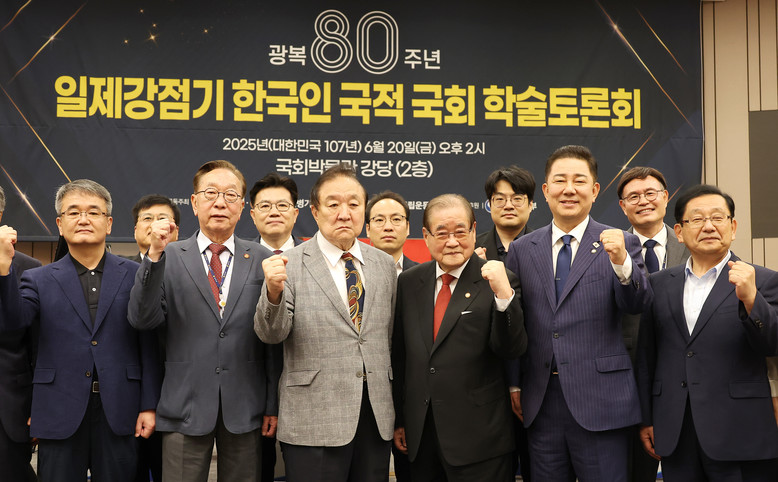 [세계타임즈 = 신상철 기자] 더불어민주당 김병기 당대표 직무대행 겸 원내대표(앞줄 오른쪽 두번째부터), 이종찬 광복회장, 정대철 헌정회장 등 참석자들이 20일 서울 여의도 국회박물관에서 열린 '광복 80주년 일제강점기 한국인 국적 학술토론회'에서 기념 촬영을 하며 파이팅하고 있다. 2025.6.20