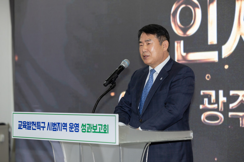 이정선 광주광역시교육감이 20일 홀리데이인 광주호텔에서 열린 ‘교육발전특구 시범지역 운영 성과보고회’에 참석해 광주광역시와 함께 추진하고 있는 '광주 교육발전특구'가 우수사례로 선정됨에 따라 인사말을 하고 있다.