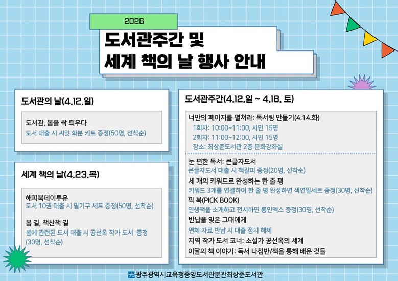 도서관의 날인 12일에는 본관의 경우 도서 대출자를 대상으로 북스토퍼를 증정하는 ‘기억까지 집어주는 책’ 행사를 열며, 분관 최상준도서관에서는 ‘도서관, 봄을 싹 틔우다’를 주제로 씨앗 화분 키트를 제공한다.