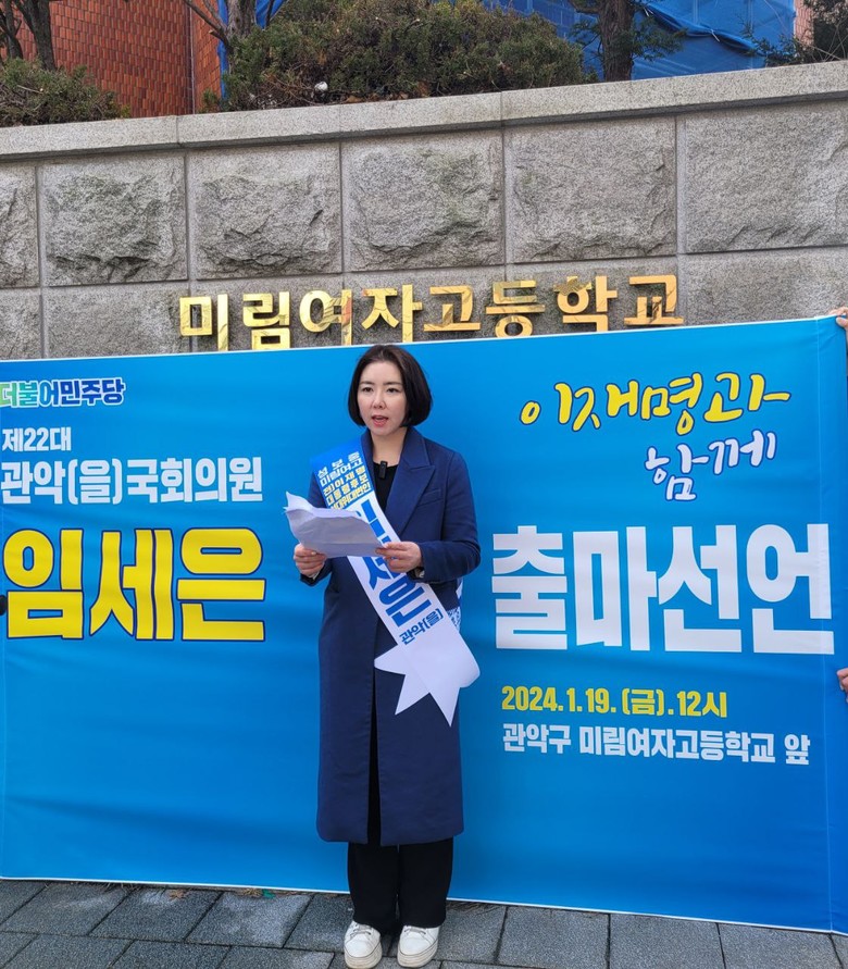 [세계타임즈 = 심귀영 기자] 더불어민주당 임세은 국회의원 예비후보가 제22대 국회의원선거 관악구을 예비후보자 등록을 완료하고 모교인 미림여자고등학교 앞에서 출마 기자회견을 개최했다.