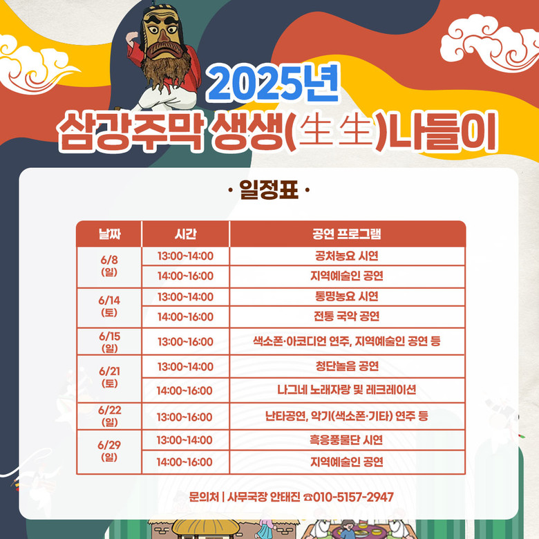 이번 공연은 8일을 시작으로 14, 15, 21, 22, 29일 총 6회 공연으로 오후 1시부터 4시까지 펼쳐지며 삼강주막을 찾는 주민들이 일상의 무게를 내려놓고 우리 고유의 흥과 신명을 마음껏 누릴 수 있도록 퓨전국악, 전통무용, 사물놀이, 기악합주, 민요 등 다양한 지역예술인의 프로그램으로 구성되었다.