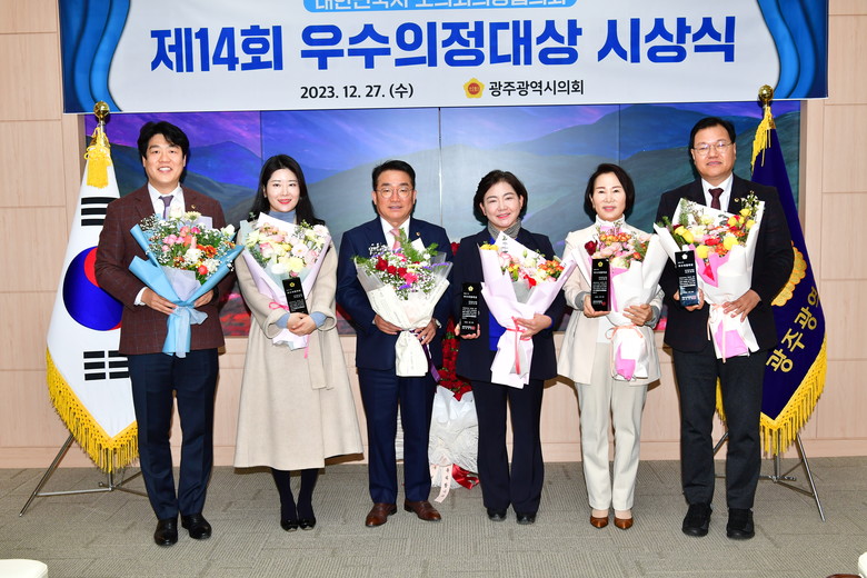[광주 세계타임즈=손권일 기자] 광주광역시의회는 27일(수) 시의회 열린시민홀에서 ‘제14회 우수의정대상’ 수상 의원(김용임, 박미정, 박희율, 안평환, 채은지) 시상식을 개최했다.
