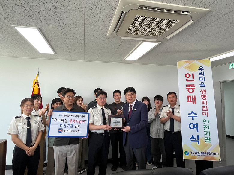▸ 심폐소생술부터 외상 처치까지 실습 중심 교육으로 현장 대응력 강화 [세계타임즈=대구 한윤석 기자] 대구농수산물유통관리공사(사장 김상덕, 이하 ‘공사’)는 24일(목) 대구소방안전본부로부터 ‘우리마을 생명지킴이 안전기관’으로 공식 지정돼 인증패를 수여 받았다.