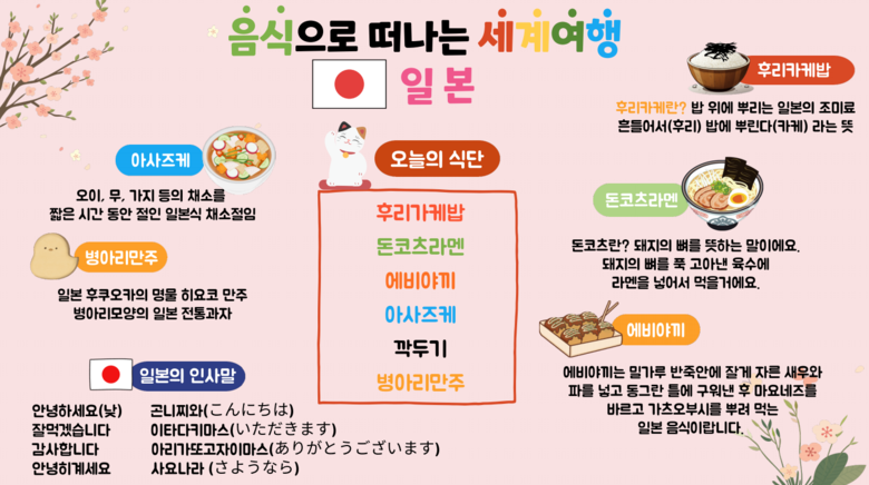 ◦일본의 대표적인 음식과 유래 등 다양한 문화를 체험할 수 있도록 함