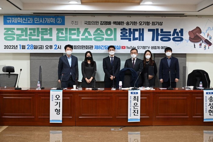 [세계타임즈 이영진 기자]국회 정무위원회 오기형 의원(서울 도봉을)은 28일 오후 국회의원회관 제8간담회의실에서 김영배, 백혜련, 송기헌, 최기상 의원과 공동으로 「규제혁신과 민사개혁 ②: 증권관련 집단소송의 확대 가능성」이라는 제목의 토론회를 열고, 집단소송 법제의 진화방향에 대해 논의했다.