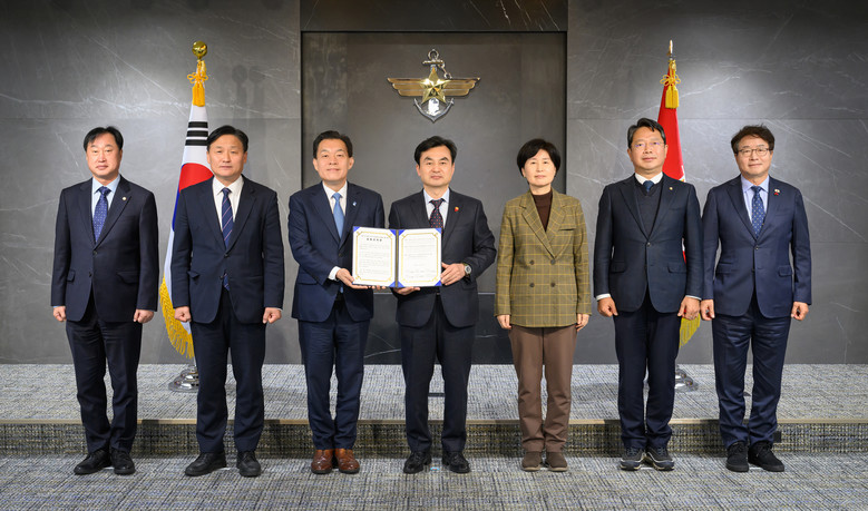 | ▲ 이재준 수원시장(왼쪽 세 번째)과 수원 지역 국회의원 5명이 안규백 국방부장관(왼쪽 4번째)에게 ‘수원 군 공항 이전의 국가전략 사업화를 위한 공동 건의문’을 전달한 후 함께하고 있다. 왼쪽부터 김준혁 의원, 김영진 의원, 이재준 시장, 안규백 장관, 백혜련 의원, 김승원 의원, 염태영 의원. 국방부 제공. |
